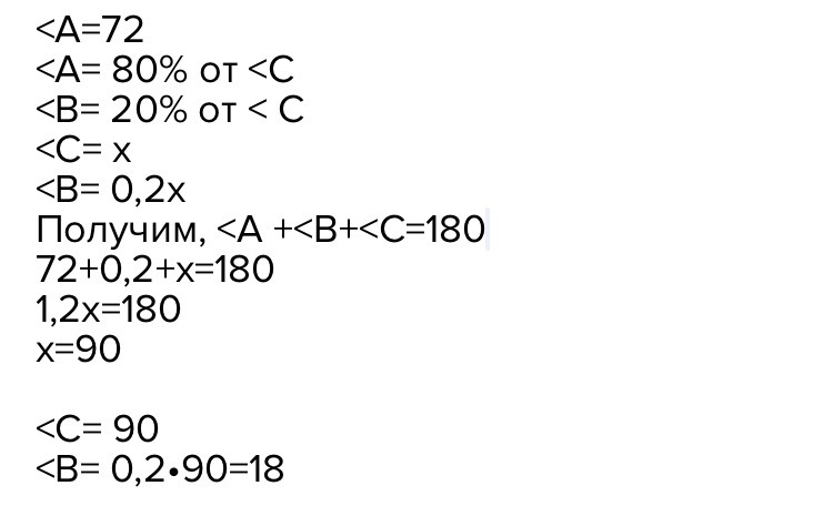 В треугольнике АВС <А=72 градуса он составляет 80 процентов а <В-20% от <С. Сколько градусов содержат В и С треугольника АВС помогите пж