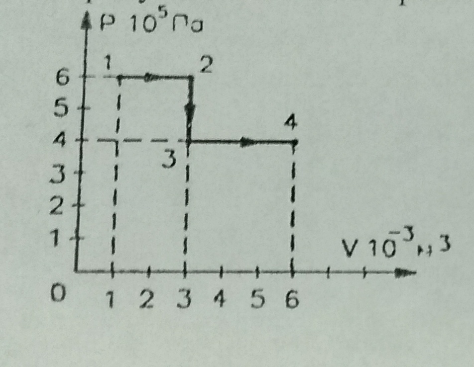Идеальный газ переходит из состояния 1 в состояние 4 так, как показанно на рисунке. Вычислите работу, совершаемую газом.