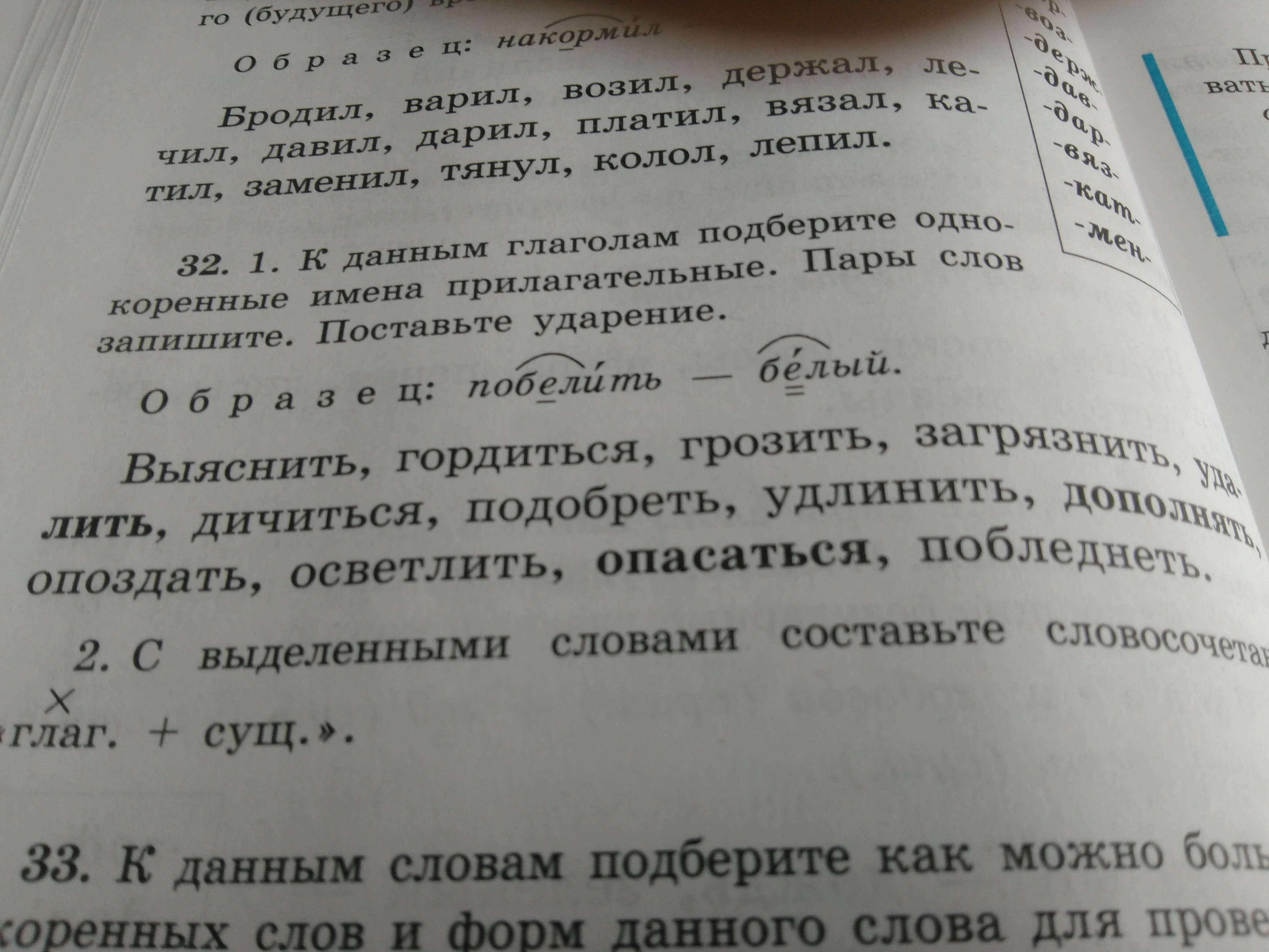 гордиться собой, грозить пальцем, загрязнить территорию, удалить файл, дичиться нас, подобреть к человеку, удлинить провод, дополнять ответ, опоздать на урок, осветлить комнату, опасаться беды, побледнеть от страха