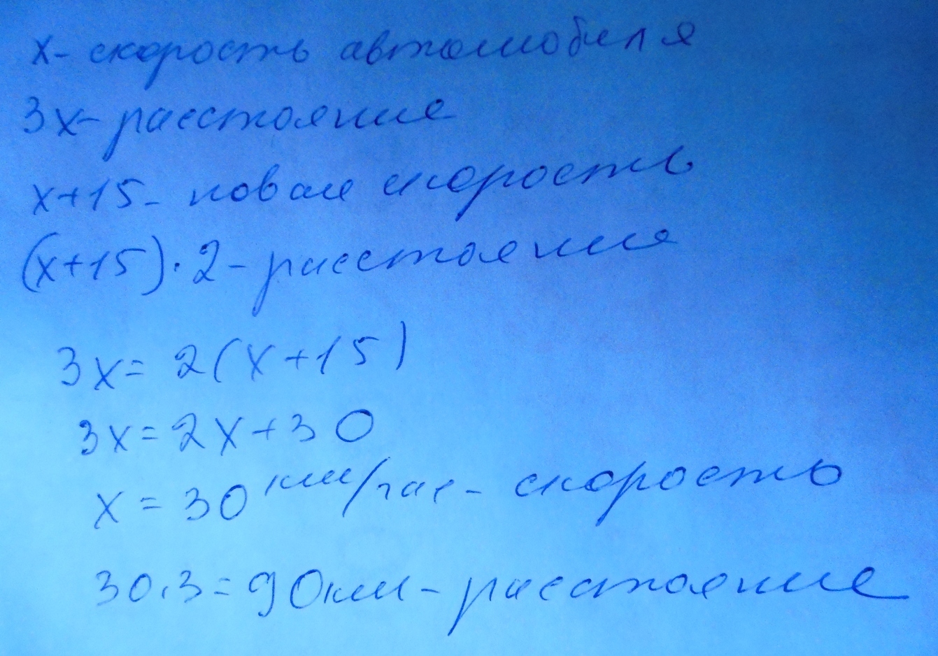 Помогите пожалуйста решить задачу с помощью уравнения :Расстояние между городами автомобиль преодолевает за 3 ч. Если бы его скорость была на 15 км/ч больше, то на этот путь потребовалось бы 2 ч. Определите скорость автомобиля и расстояние между городами.