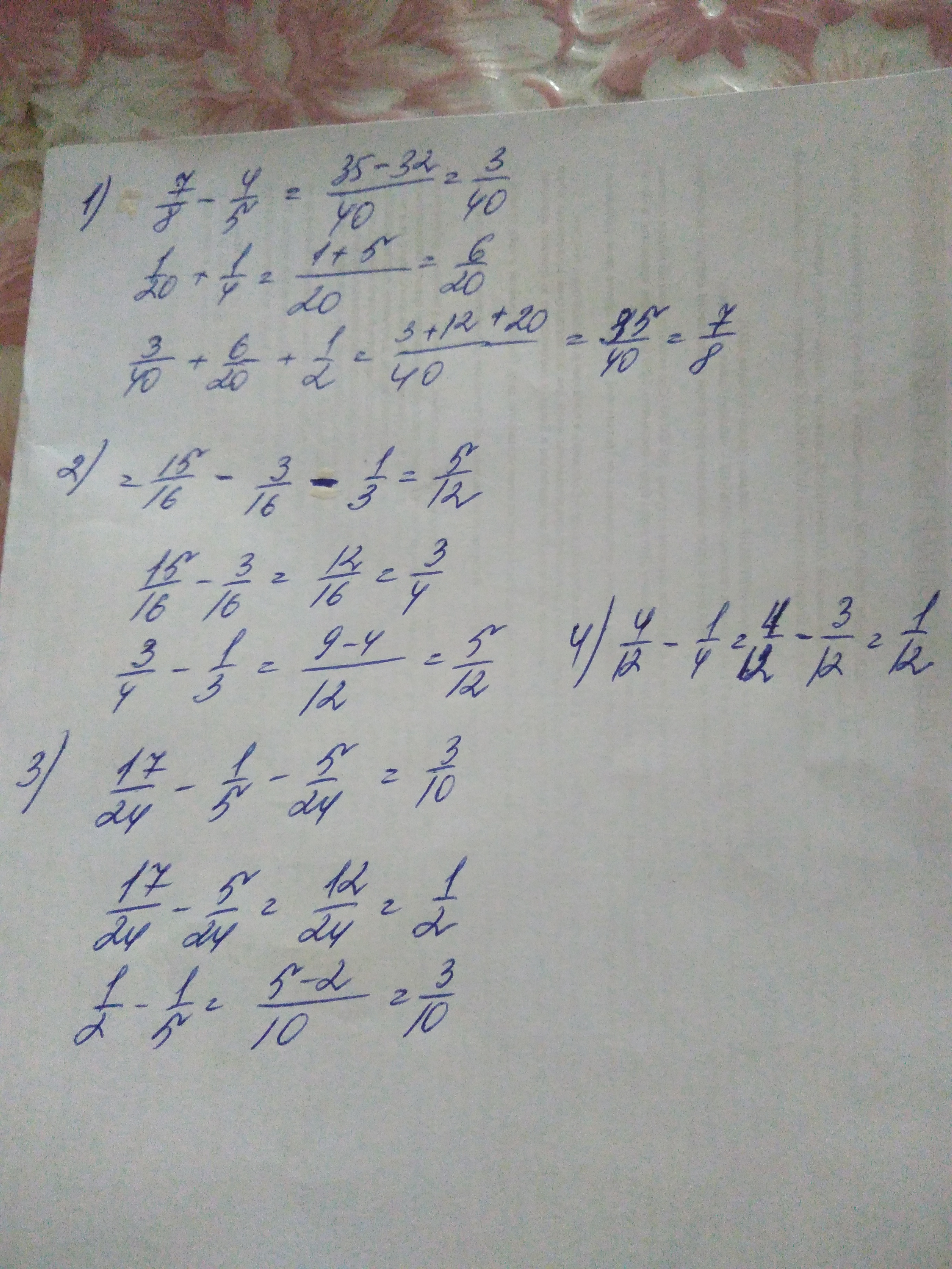 1. (7/8 - 4/5) + (1/20 + 1/4) + 1/2