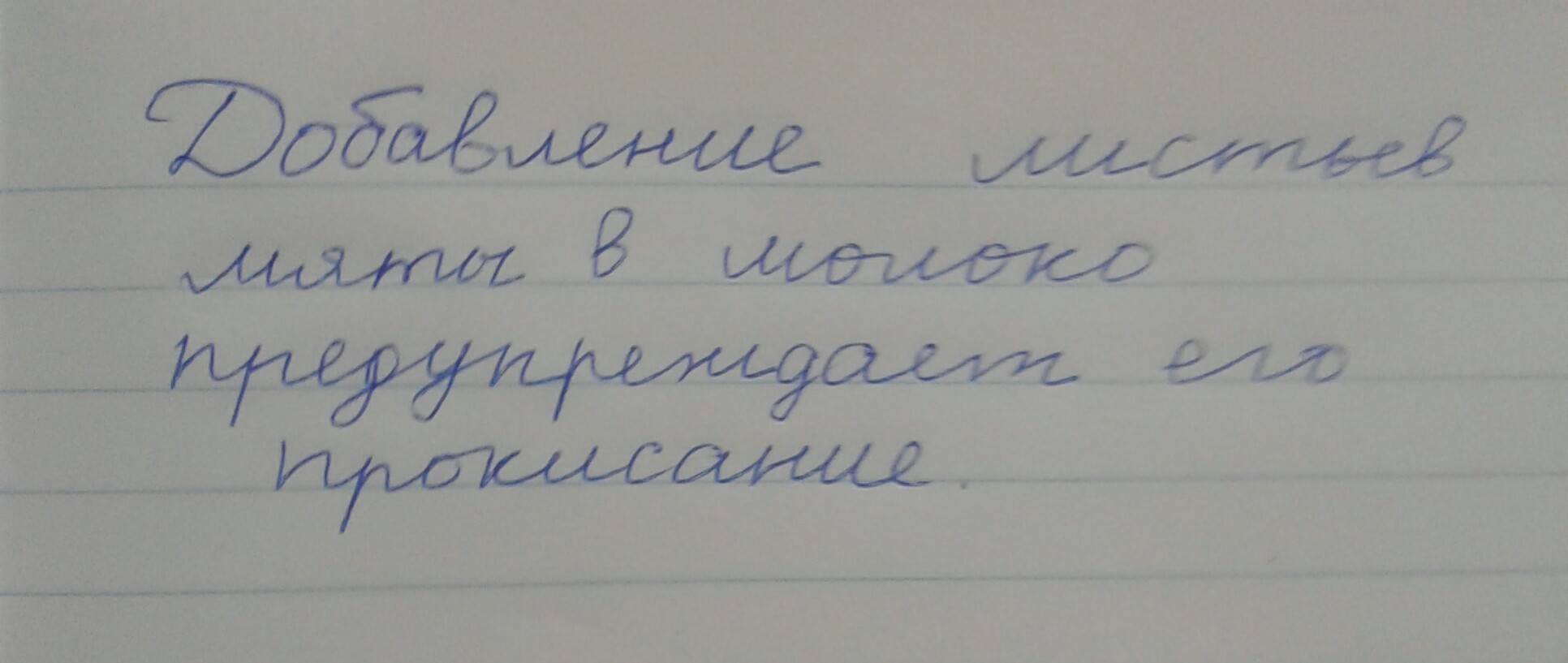 1)Что?добавление;2)(добавление чего?)листьев;3)(листьев чего?) мяты;4)(куда?)в молоко;5)(что делает?)предупреждает;6)(кого?)его;7) (его что?)прокисание.