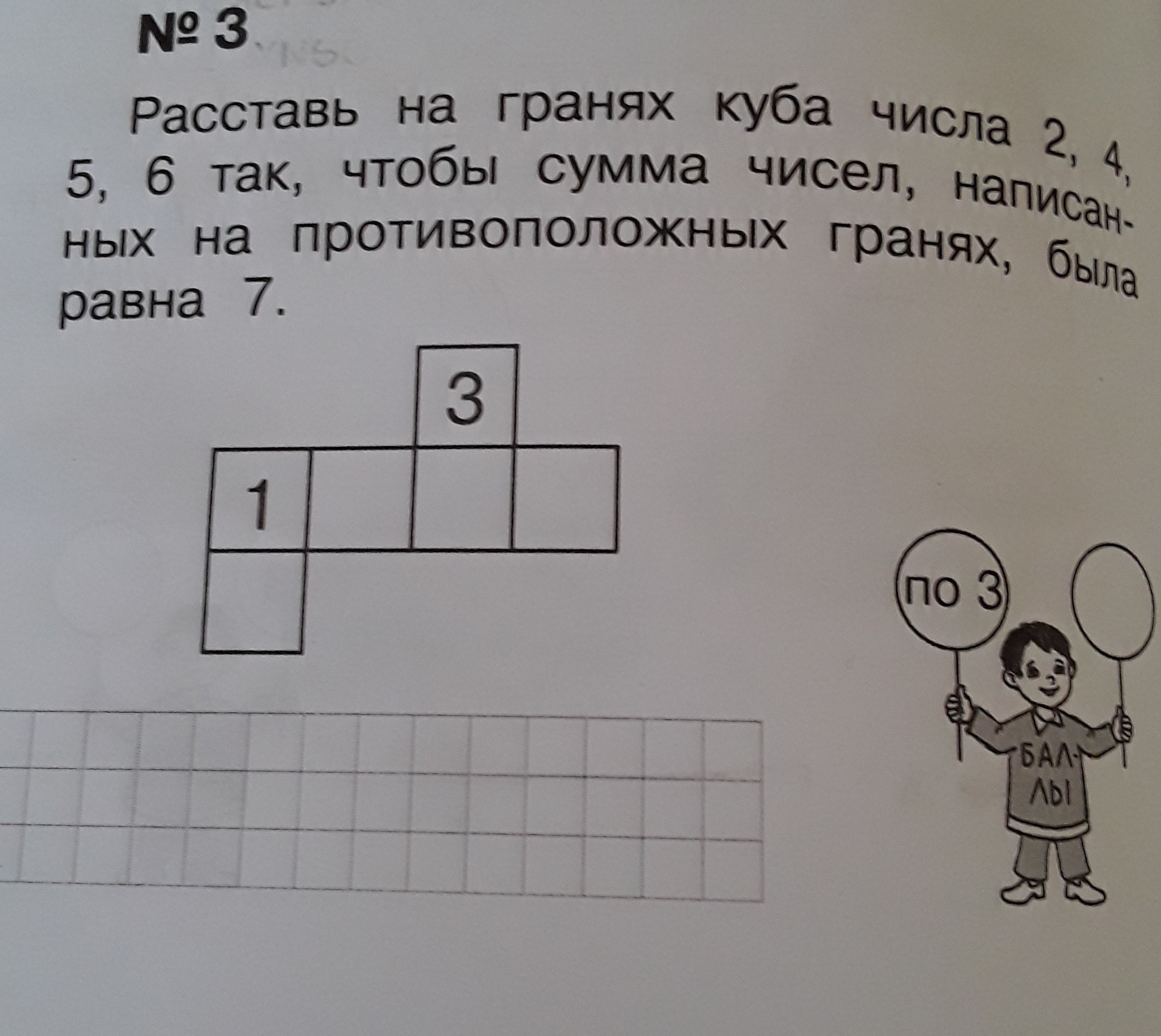 Расставь на гранях куба числа 2,4,5,6 так,чтобы сумма чисел ,написанных на противоположных гранях,была равна 7.