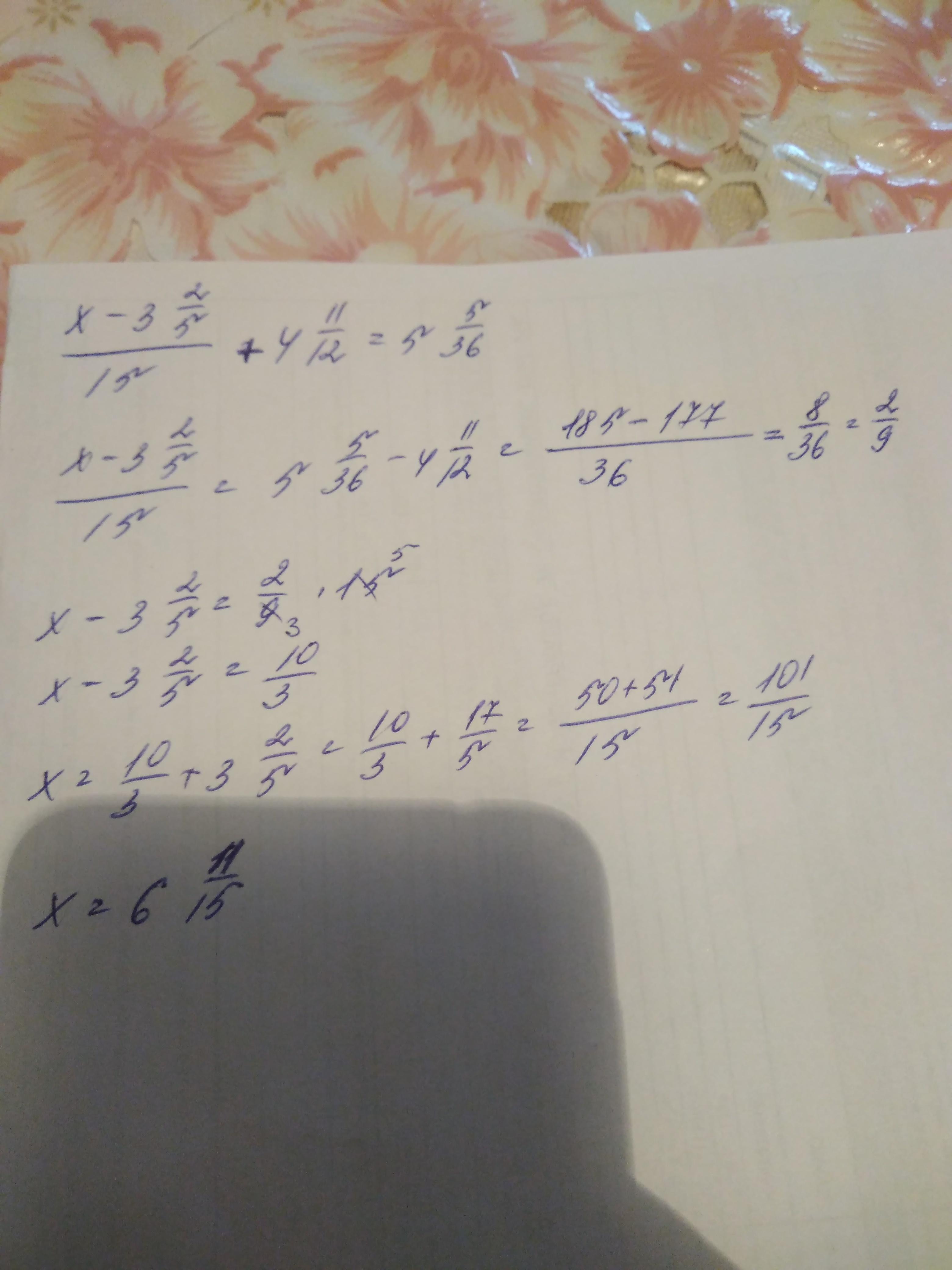 (Х минус три целых две пятых):15+4 целых 11 двенацатых =5 целых 5 тридцатьшестыз