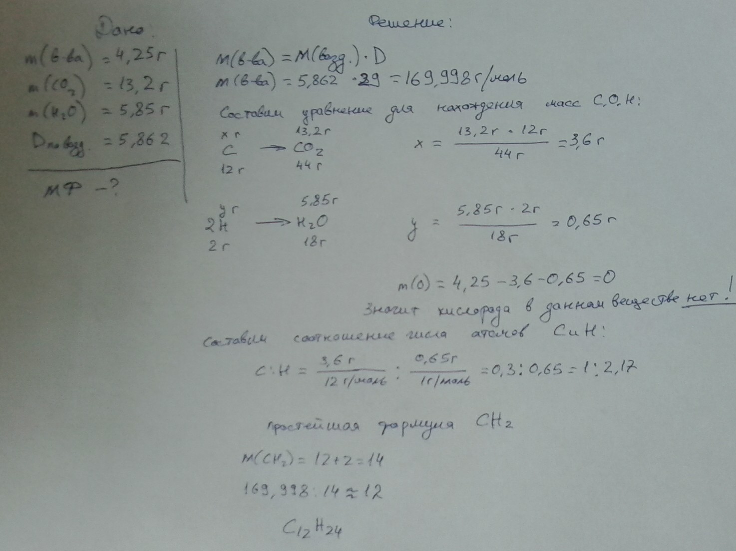 При сгорании вещества массой 4,25 г образовались углекислый газ массой 13,2 г и воды массой 5,85 г. Плотность паров вещества по воздуху равна 5,862. Определите формулу вещества.