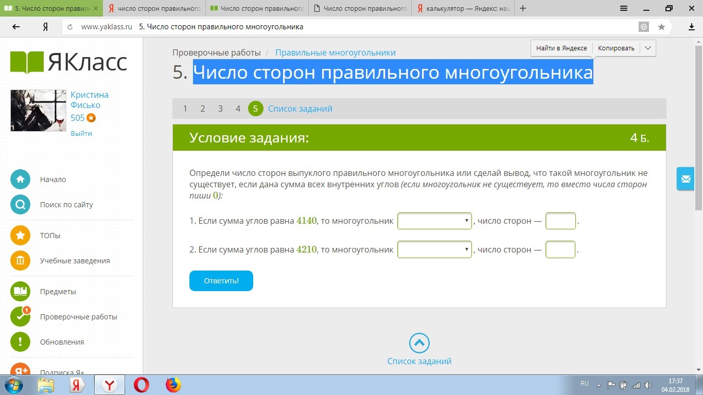 Вычисленное число сторон не целое, выпуклого многоугольника с такой суммой внутренних углов не существует.
