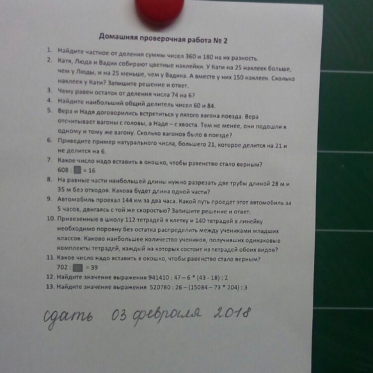 1) 360+180/360-180=540/180=3 2) x+(x-25)+(x+25)=150 3x=150 x=150/3 х=3 3) 2 4)12 5) 9 6) 63 7)38 8) 7м 9) 144:2=67(км)- проехал автомобиль за один час 67*5=335(км)- проедет авто за пять часов 10) 112 11) 18 12) 1 действие=25 2д=20030 3д=150 4д=75 5д=19955 13) 1д=14892 2д=192 3д=20030 4д=64 5д=19966