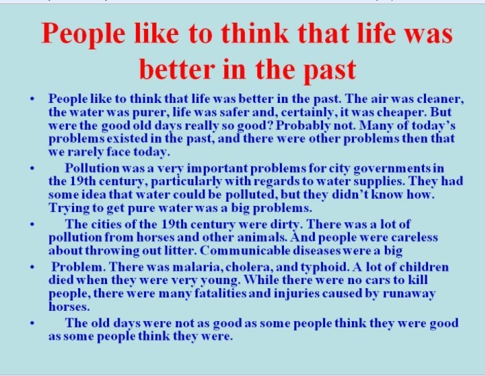 Людям нравится думать, что в прошлом жизнь была лучше. Воздух был чище, вода была чище, жизнь была более безопасной и, конечно же, была дешевле. Но были ли хорошие старые дни действительно хорошими? Наверное, нет. Многие из сегодняшних проблем существовали в прошлом, и тогда были и другие проблемы, с которыми мы редко сталкиваемся сегодня. Загрязнение было очень важными проблемами для городских властей в XIX веке, особенно в отношении водоснабжения. У них была идея, что вода может быть загрязнена, но они не знали, как это сделать. Попытка получить чистую воду была большой проблемой. Города XIX века были грязными. Было много загрязнений у лошадей и других животных. И люди небрежно бросали мусор. Инфекционные болезни были большой проблемой. Были малярия, холера и брюшной тиф. Многие дети умерли, когда они были очень молоды. Хотя не было машин, чтобы убивать людей, было много смертельных случаев и травм, вызванных убегающими лошадьми. Старые времена были не такими хорошими, как некоторые люди думали, что они хороши, как считают некоторые люди.