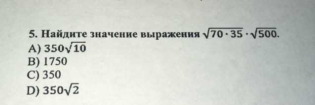 Ответ под буквой А), т.к. 70 это 7 *10 , а 35 это 5*7, выносим из под корня 7 , 500 это 100*5, корень из 100=10, 70 корней 250, 250- это 25*10, 70*5 и под корнем 10