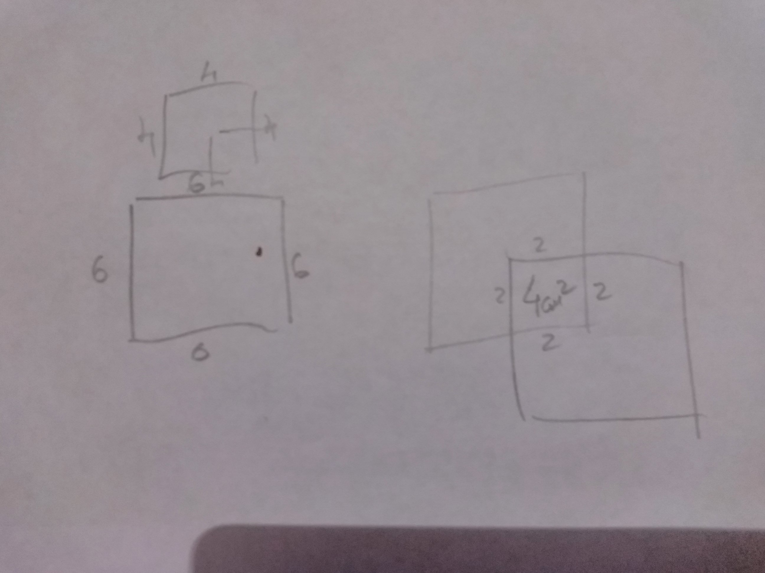 Периметр нижнего квадрата 24 см. Периметр верхнего на 8 см меньше. Найди площадь наименьшего квадрата, если известно, что сторона нижнегг квадрата при пересечении со стороной верхнего квадрата делит его сторону пополам.