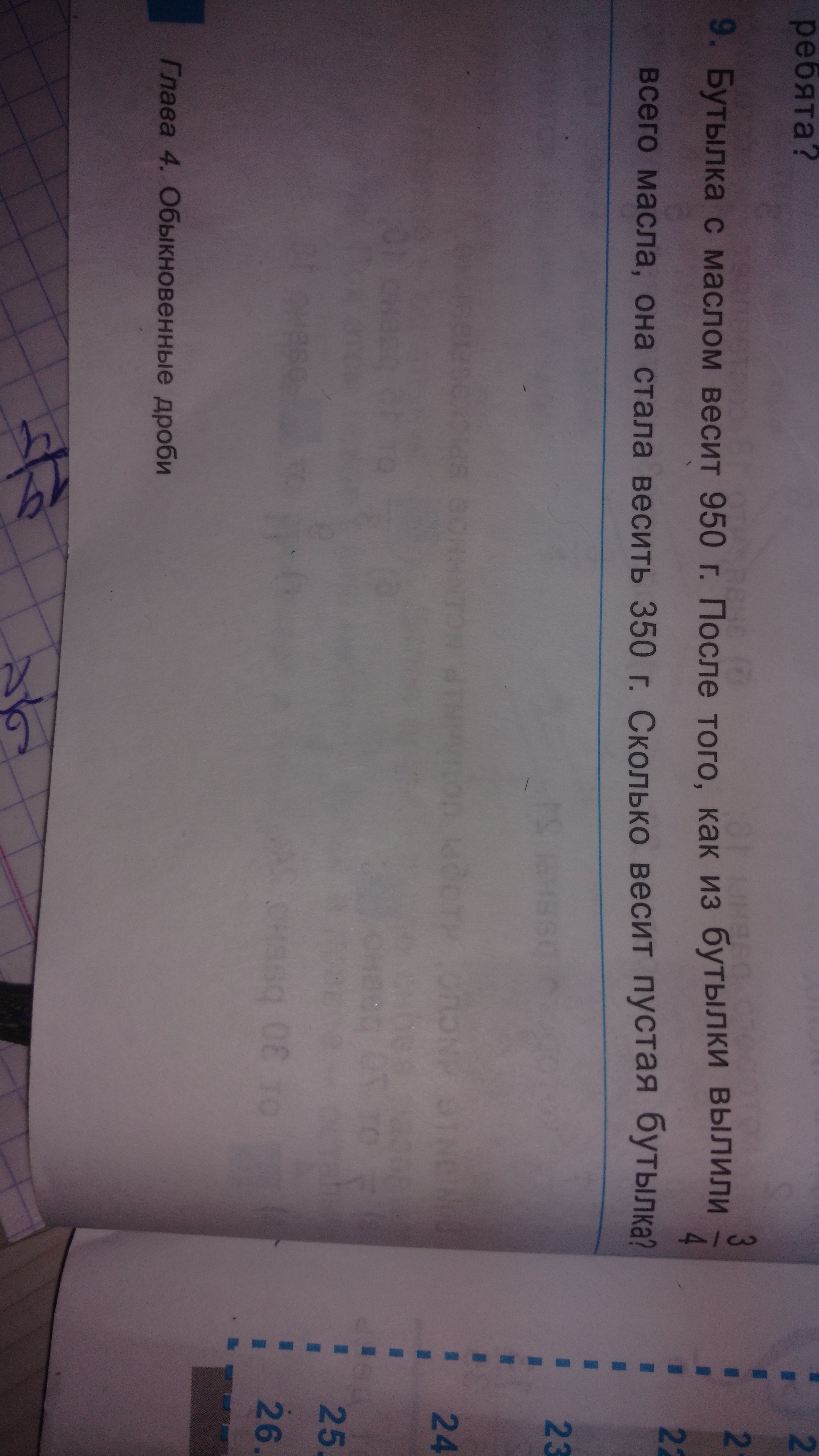 Смотри, было всего 950 г масла. Вылили 3/4 этого - осталось 350 г. Значит, 3/4 всего масла - 600 г (950 - 350). Далее, ищем по пропорции. Если 3/4 - 600 г, значит 4/4 (все масло в бутылке) - 800 г. Далее отнимаем от того, что было (950 г) всю массу масла (800 г) и остается 150 г, а это и есть масса пустой бутылки.