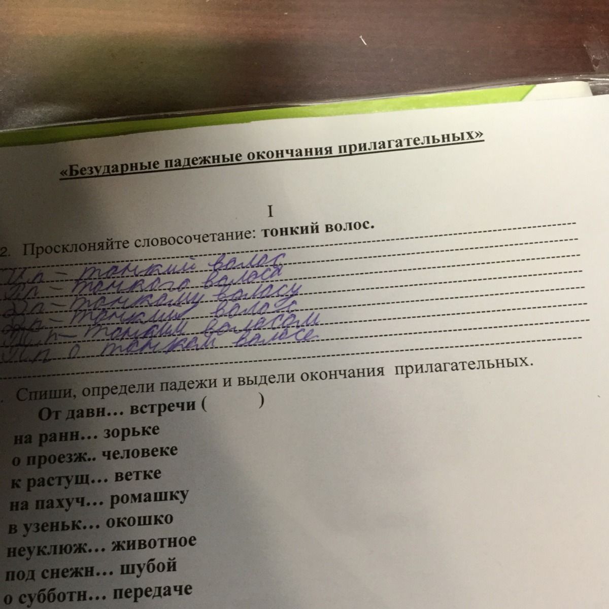 От давн[ей] встречи (Р.п.), на ранн[ей] зорьке (П.п.), о проезж[ем] человеке (П.п.), к растущ[ей] ветке (Д.п.), на пахуч[ую] ромашку (В.п.), в узеньк[ое] окошко (В.п.), неуклюж[ее] животное (И.п.), под снежн[ой] шубой (Т.п.), о субботн[ей] передаче (П.п.).
