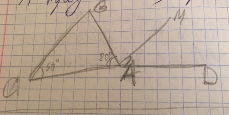 В треугольнике ABC угол А равен 80 градусам, угол С равен 50 градусам. Докажите, что биссектриса АМ угла BAD смежного с углом А треугольника, параллельна BC.
