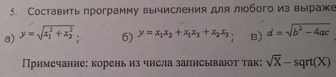 uses crt;var f,a,b,c:real;beginwriteln ('Введите число A');readln (a);writeln ('Введите число B');readln (b);writeln ('Введите число C');readln (c);F:=(sqrt(sqr(b)*2)-4*a*c);writeln('Ответ: ',f:2:1);end.