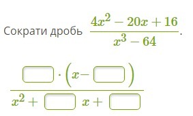 frac{4x^2-20x+16}{x^3-64} = frac{4(x^2-5x+4)}{x^3-64}= frac{4(x^2-x-4x+4)}{x^3-64}= frac{4(x(x-1)-4(x-1))}{x^3-64}= frac{4(x-4)(x-1)}{(x-4)(x^2+4x+16)}= frac{4*(x-1)}{x^2+4x+16}