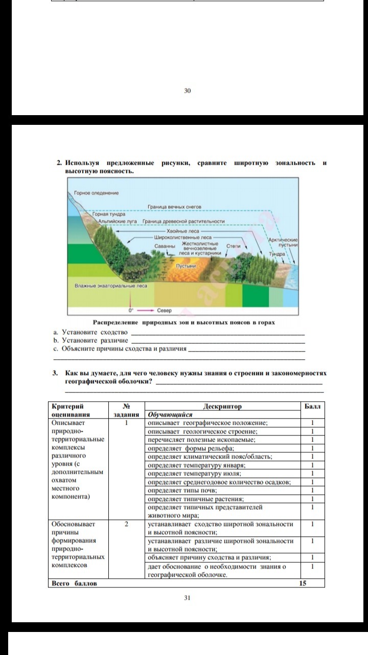 3. Широтные и высотные пояса сменяют друг друга в сходной последовательности: от экватора к полюсам и от подножья гор к вершине. Каждые 100 метров подъёма соответствуют 100 километрам в широтном направлении по равнине. Поднялись на 1 км - как будто поехали 1000 км на север (ну или на юг, если это, скажем, Анды) .