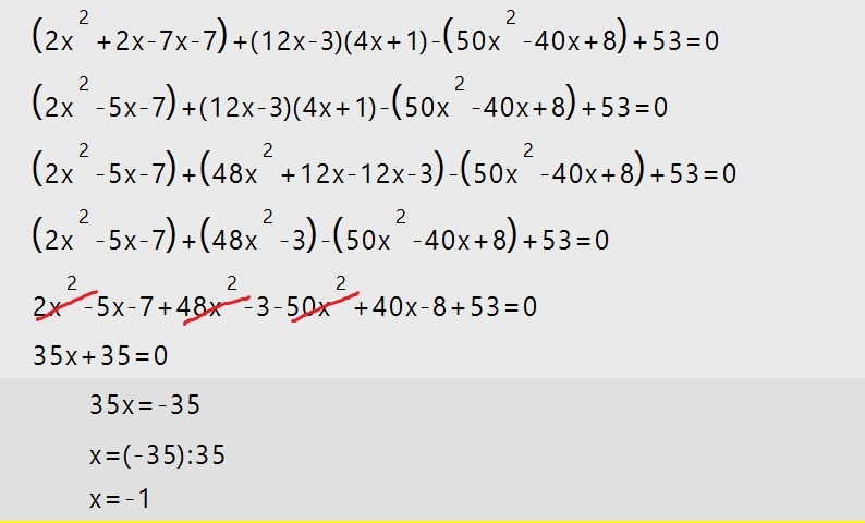 Решите уравнение (2x - 7)(x + 1) + 3(4x -1)(4x + 1)= 2(5x-2)²-53