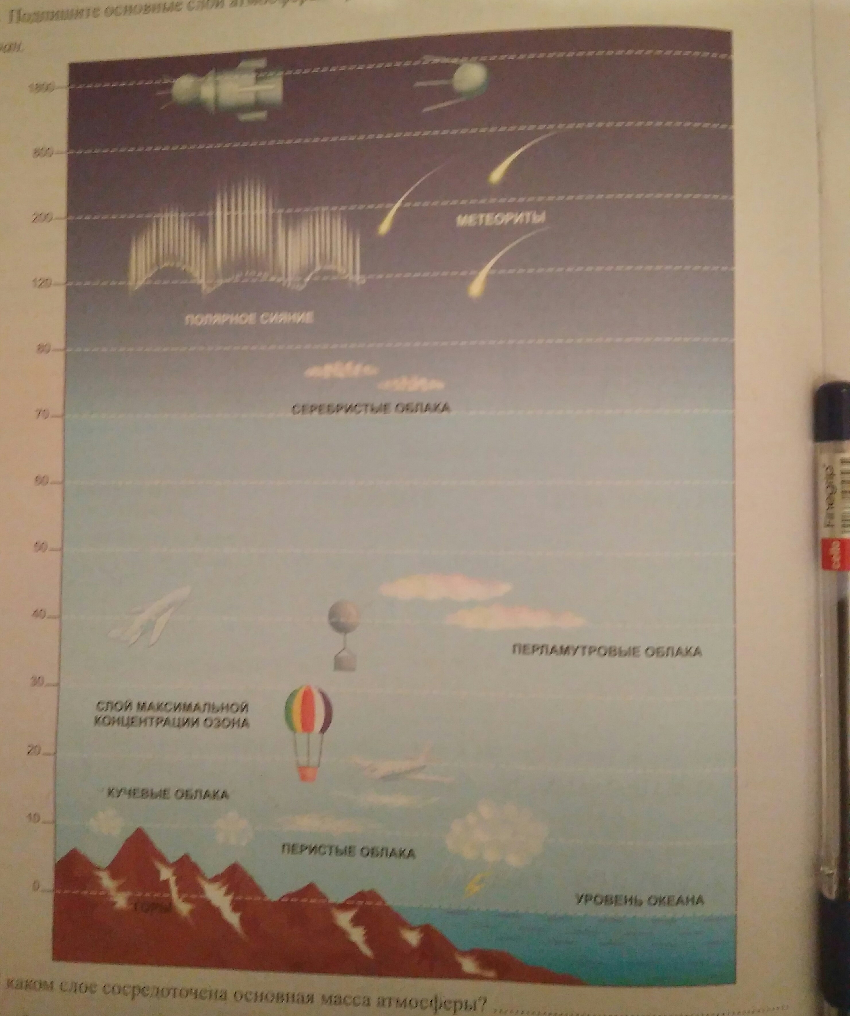подпишите основные слои атмосферы: тропосфера, стратосфера, термосфера, озоновый экран.