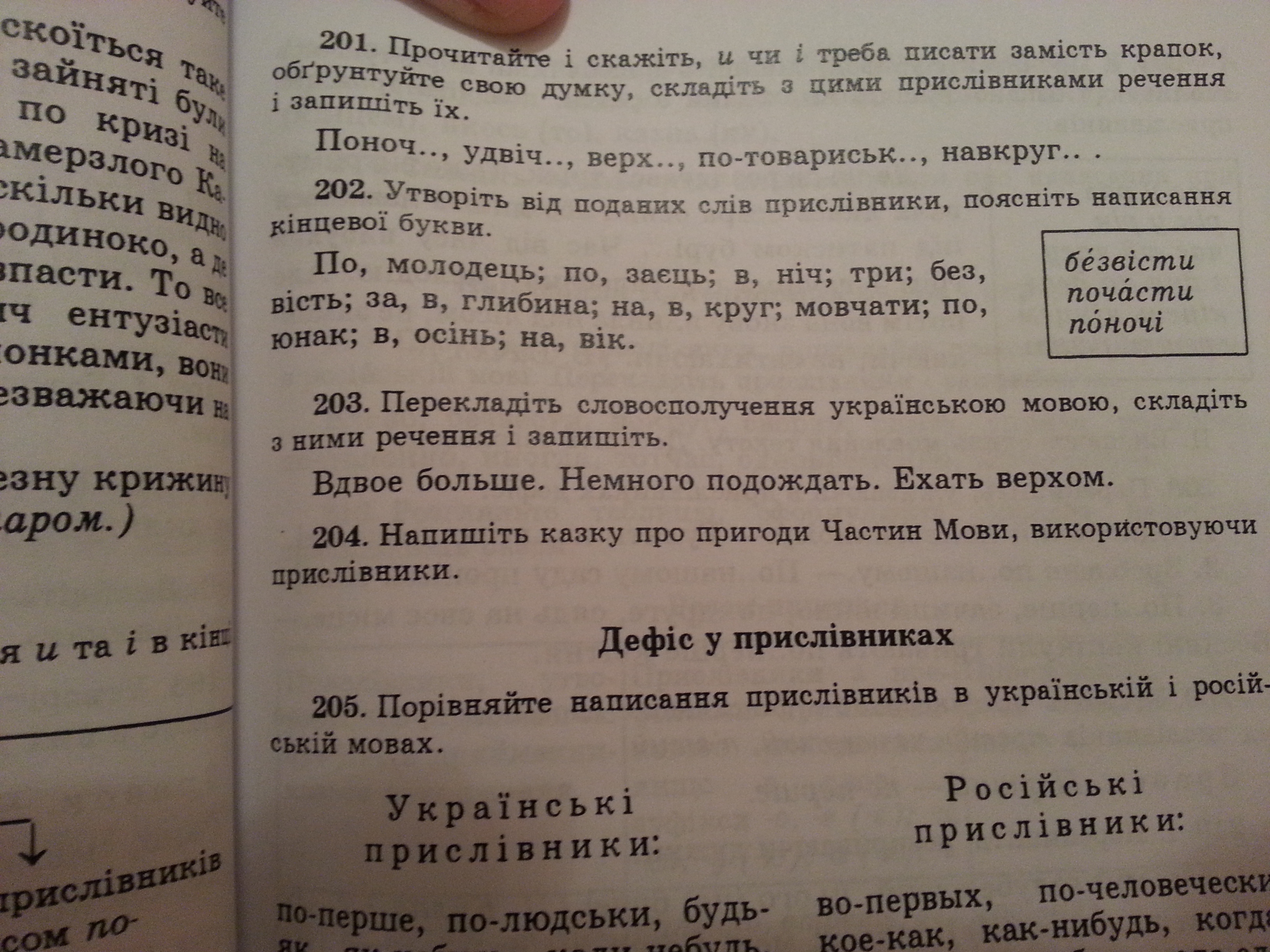 По-молодецьки, по-заячи, вночі, тричі, безвісти, завглибшки, навкруг, мовчки, по-юнацьки, восени, навік.
