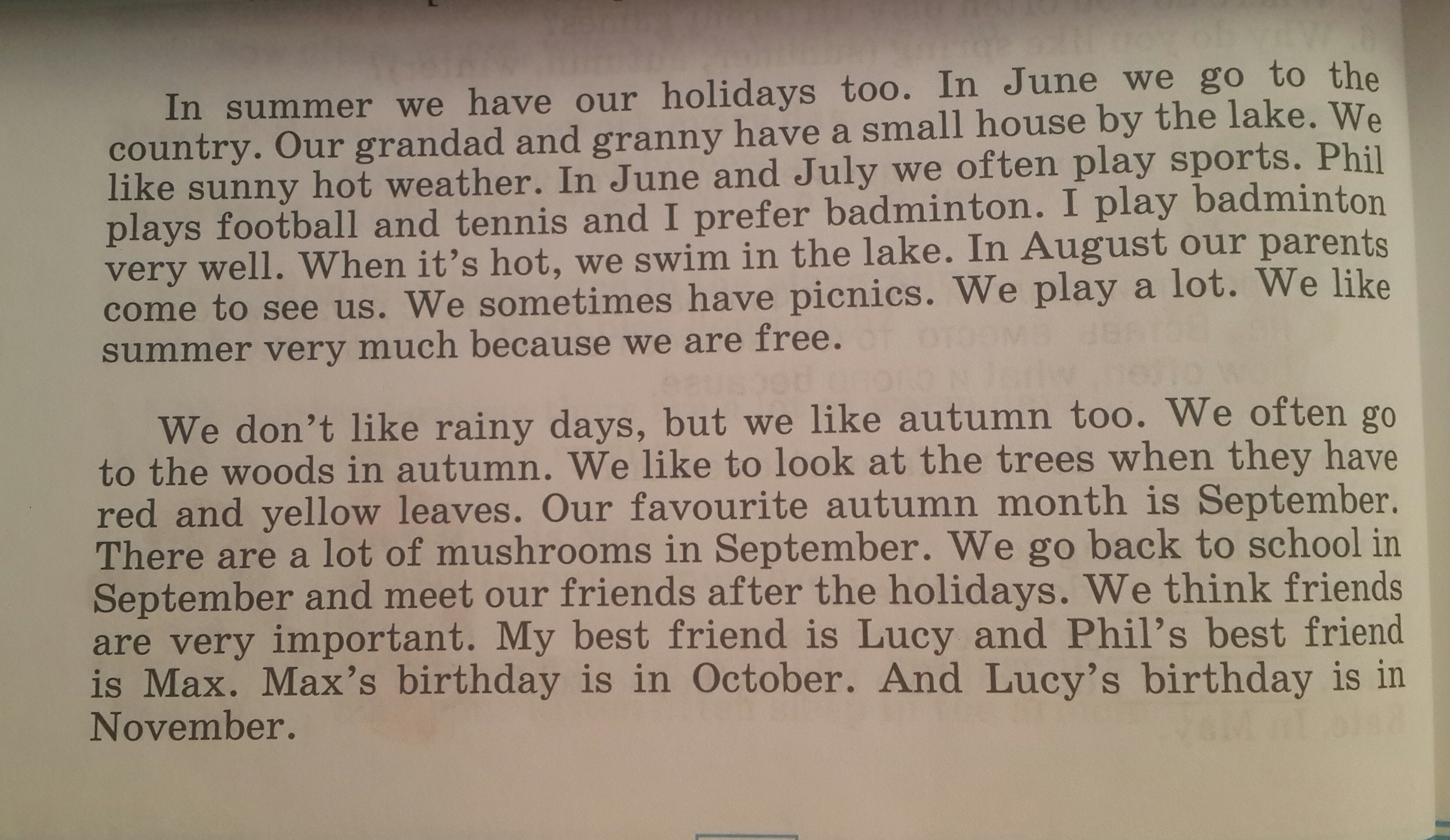 Мы не любим дождливые дни, но мы любим осень тоже. Осенью мы часто ходили в лес. Мы любим смотреть на деревья, когла у них краснып и жёлтые листья. Наш любимый осенний месяц- это сентябрь. Мы возвращаемся в школу и встречаемся с нашими друзьями после каникул. Мы думаем, что друзья это очень важно. Моя лучшая подруга - Люси, а лучший друг Фила- Макс. День рождения Макса в октябре. А День рождения Люси в ноябре.