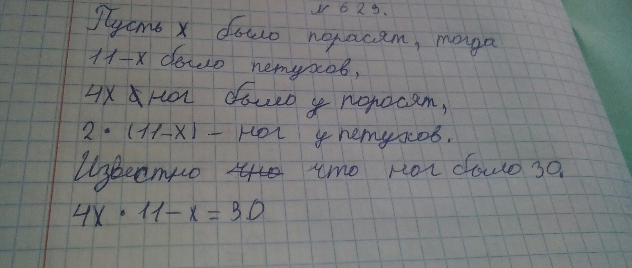 помагите пожалуйста решить уравнение пусть х было поросят, тогда11-х было петухов, 4х ног было у поросят , 2•(11-х) ног у петухов. известно что ног было 30 начало уравнения: 4х•11-х=30 помогите))) плиз сделать еще и арефметическим способом
