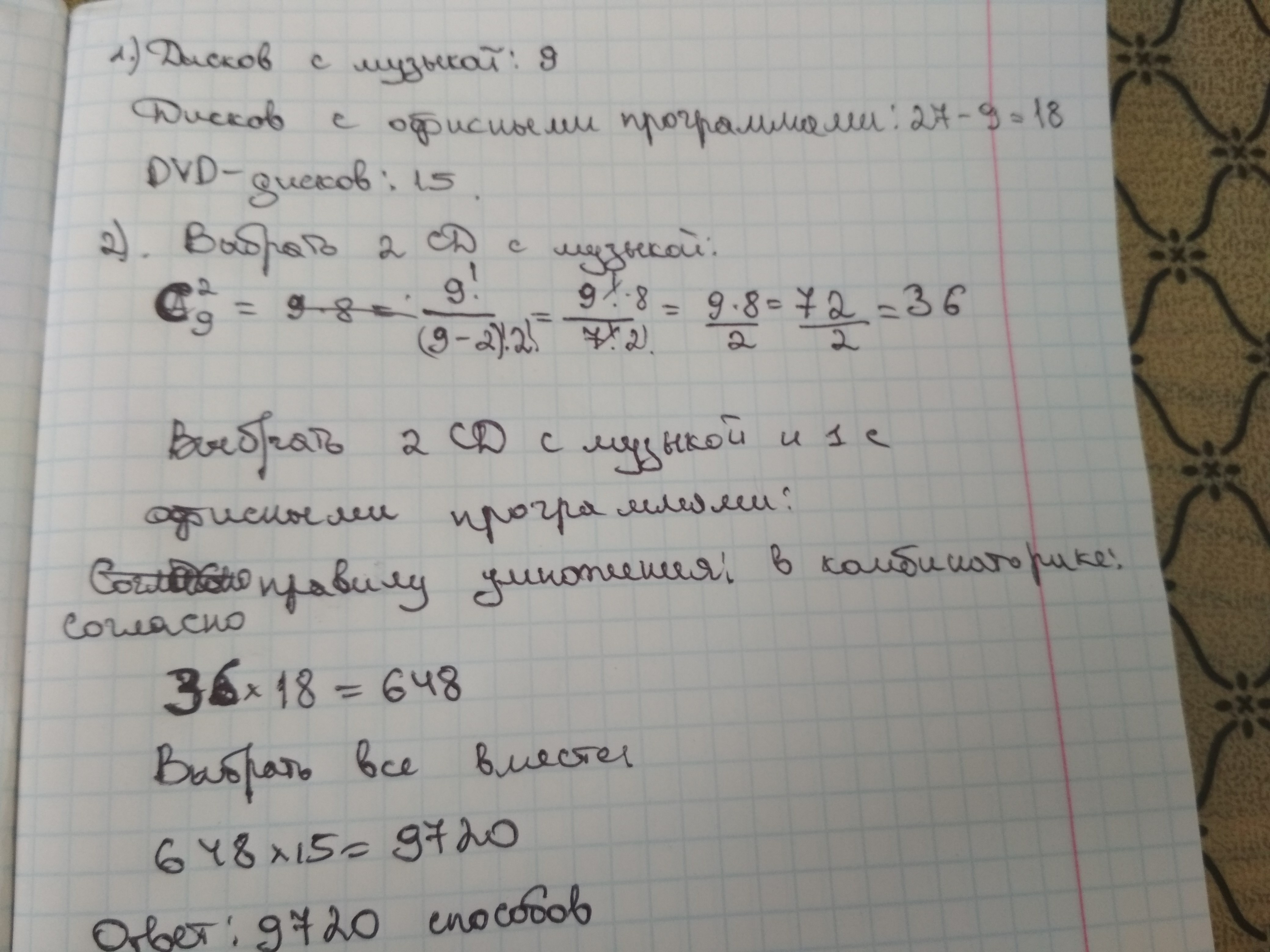 На полке стоят 27 CD-дисков и 15 DVD-дисков,причем 9 CD-дисков с музыкой, а остальные -с офисными программами.Сколькими способами можно выбрать 2 CD с музыкой ,1 с офисными программами и 1 DVD-диск ,если все диски различны?