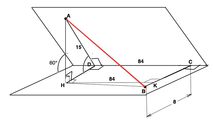 концы отрезка AB лежат на гранях двугранного угла равного 60. Из точек A и B проведены перпендикуляры AD и BC к ребру двугранного угла. Определить AB если DC=84, AD=15, BC=8см