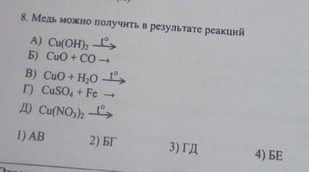 Медь можно получить в результате реакций Б и Г то есть правильный вариант 2