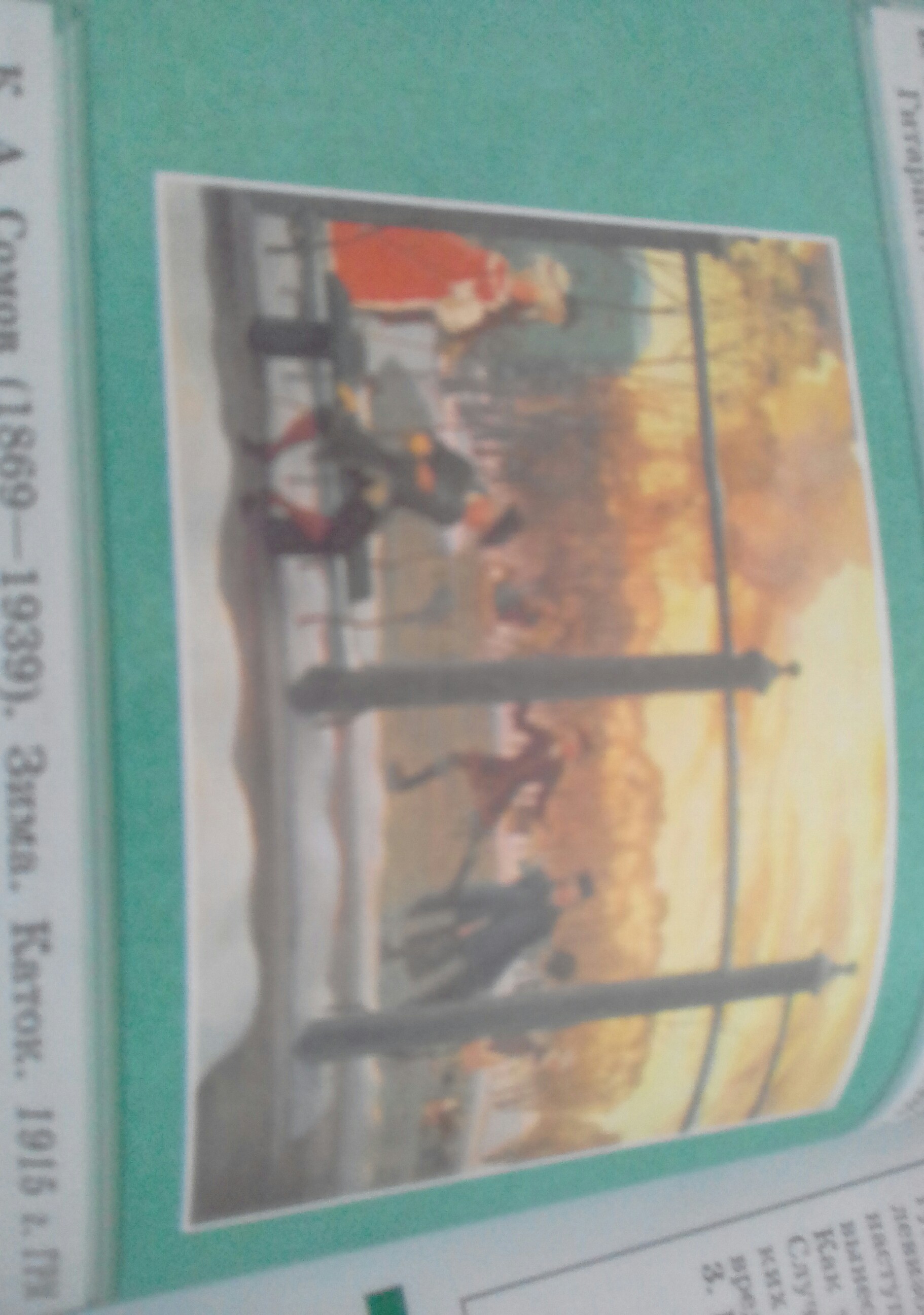 Вечер. Местные и приезжие люди приходят к катку. И взрослы и дети катаются на катке. Белый снег лежит по обочинам, скорее всего это конец зимы. Люди одеты не очень тепло, значит на улице не холодно.