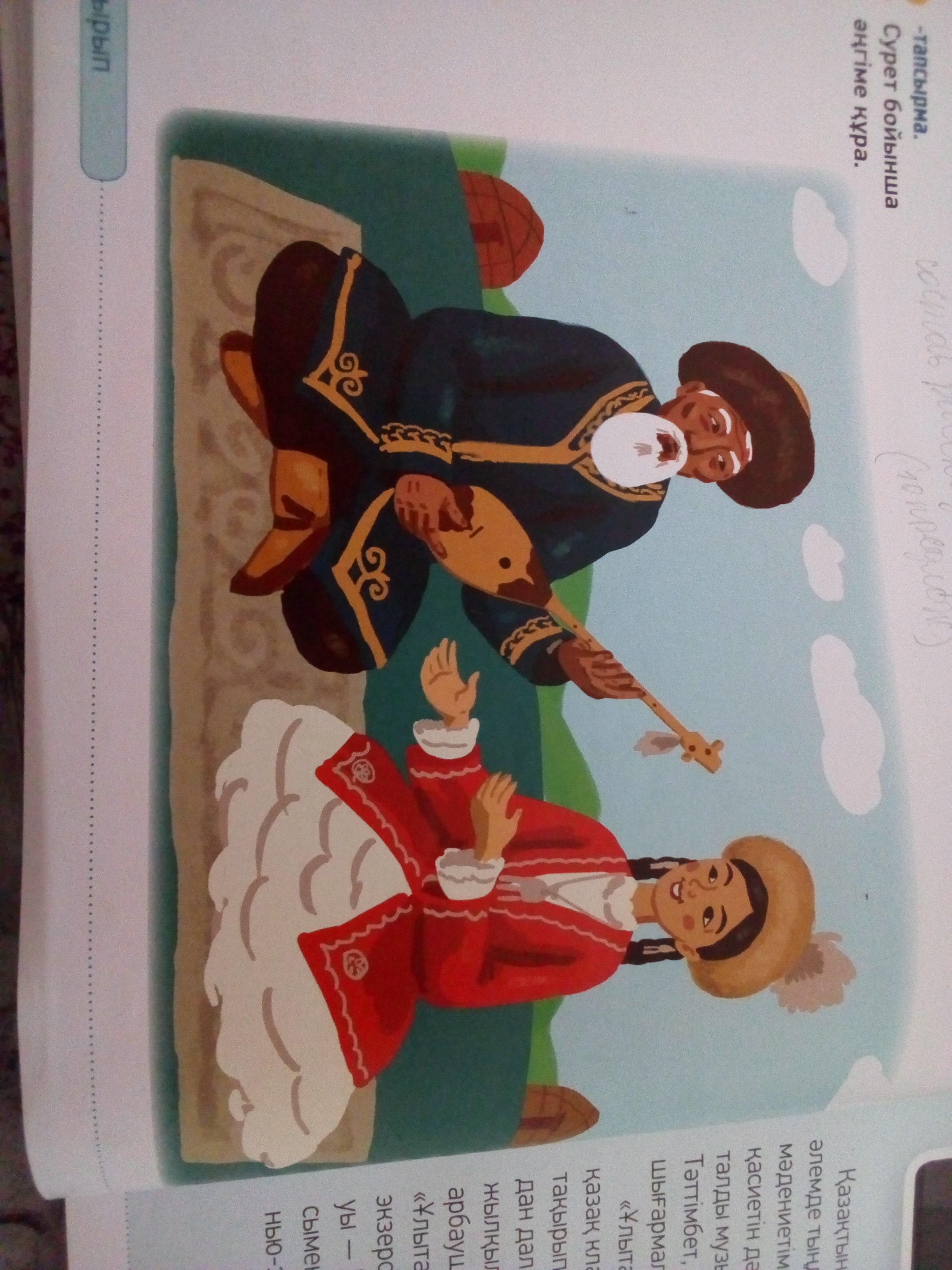 Кешке атам жайлаудан келип,мени касына шакырды .АТАМ:кызым олен айтайык деди Содан атам оз домбырасын алып,куй тарта бастады. Солай атам екеумиз кешти жаксы откиздик.