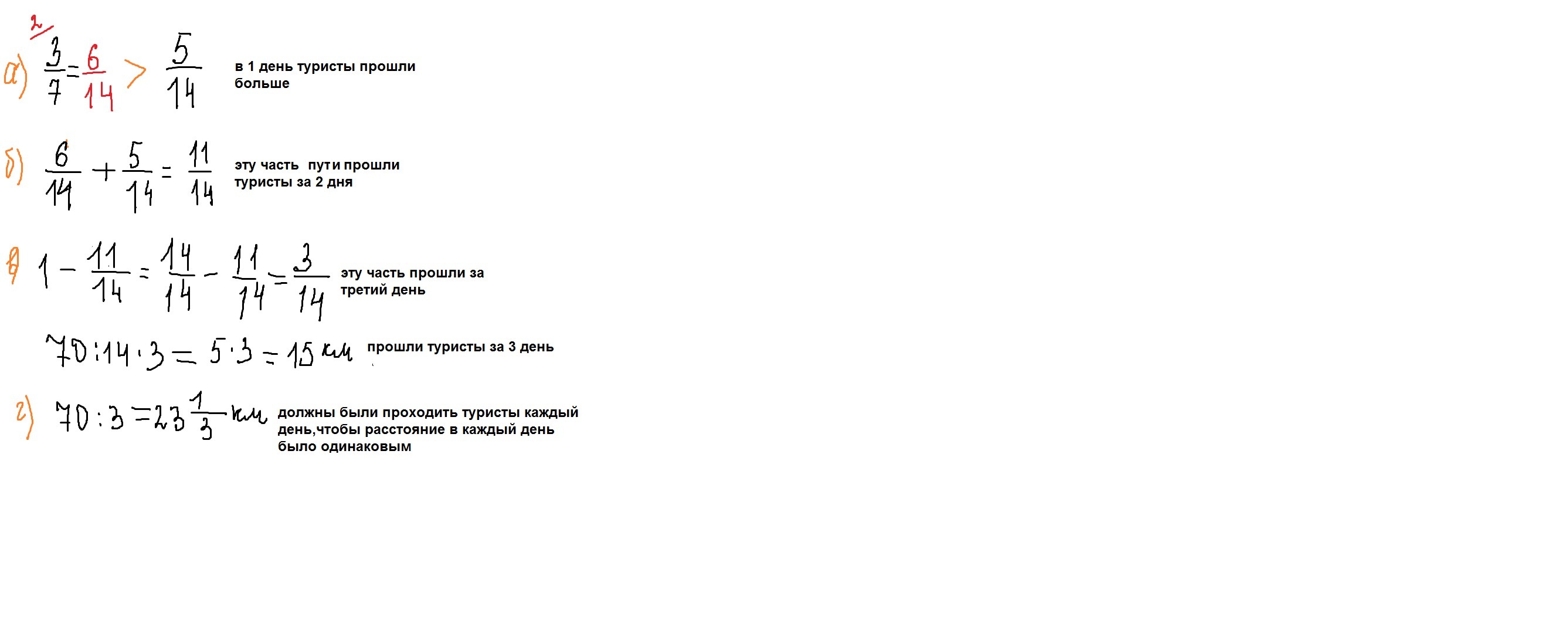 Значит что а) 3/7 и 5/14 общий знаменатель 14= 6/14>5/14 а)Ответ:в 1 день.б)6/14+5/14=11/14.в)70:14=5.5*3=15 км. г)70:3=23,3 км. (насчёт этого неуверен, я взял 70 км, не знаю сколько у вас там.)