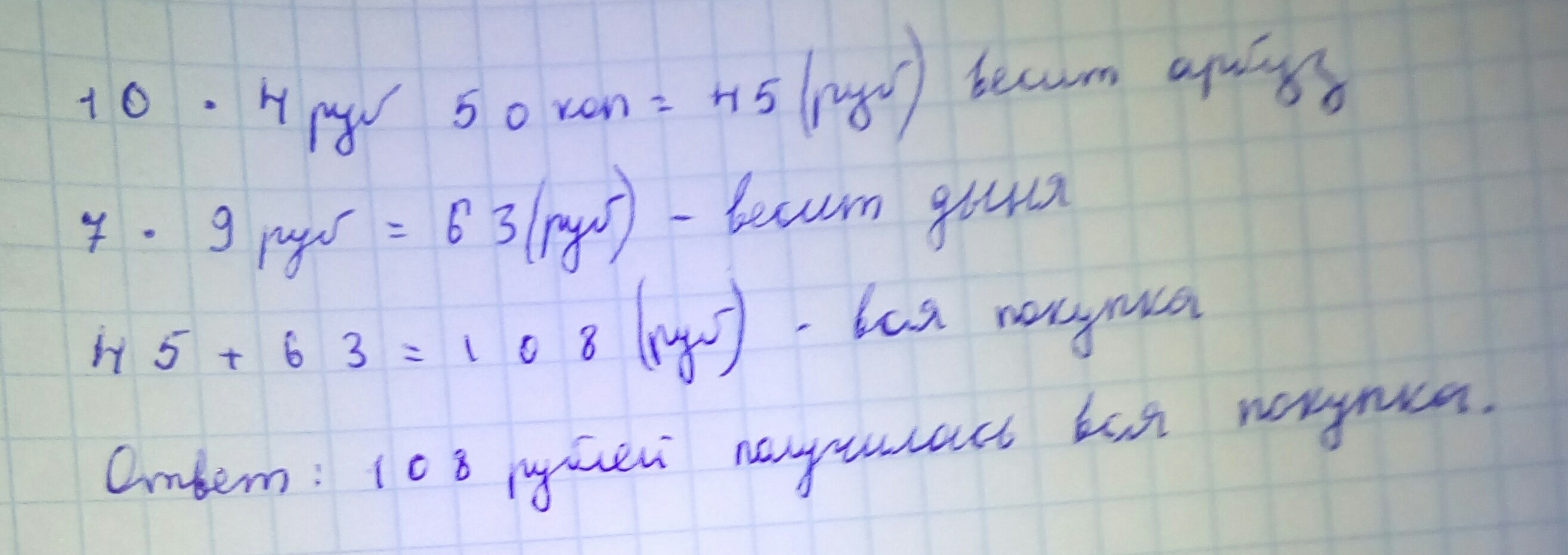 Папа купил арбуз и дыню.Сколько он заплатил за покупку,если арбуз весил 10 кг по цене 4 рубля 50 копеек,а дыня весила 7 кг по цене 9 рублей. Краткую запись пожалуйста