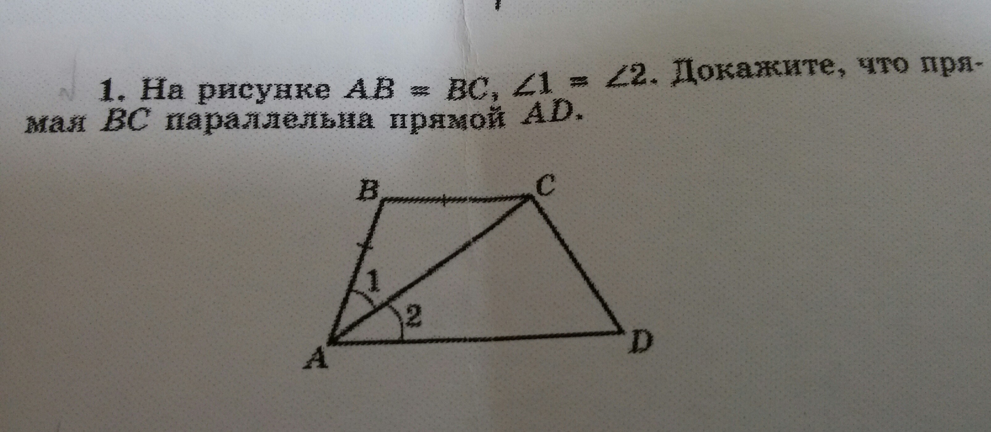На рисунке AB = BC, угол 1 = углу 2. Докажите, что прямая BC параллельна прямой AD.