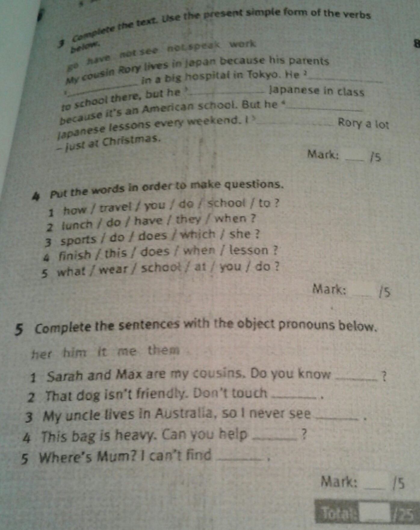 #5. 1) Sarah and Max are my cousins. Do you know them? 2) That dog isn't friendly. Don't touch it. 3) My uncle lives in Australia, so I never see him. 4) This bag is heavy. Can you help me? 5) Where's Mum? I can't find her.
