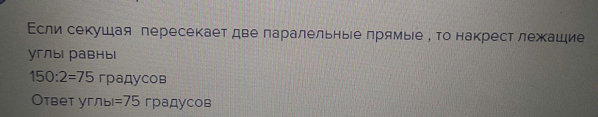 Сумма двух внутренних накрест лежащих углов, образованных паралельными прямыми и секущей, равна 150°.