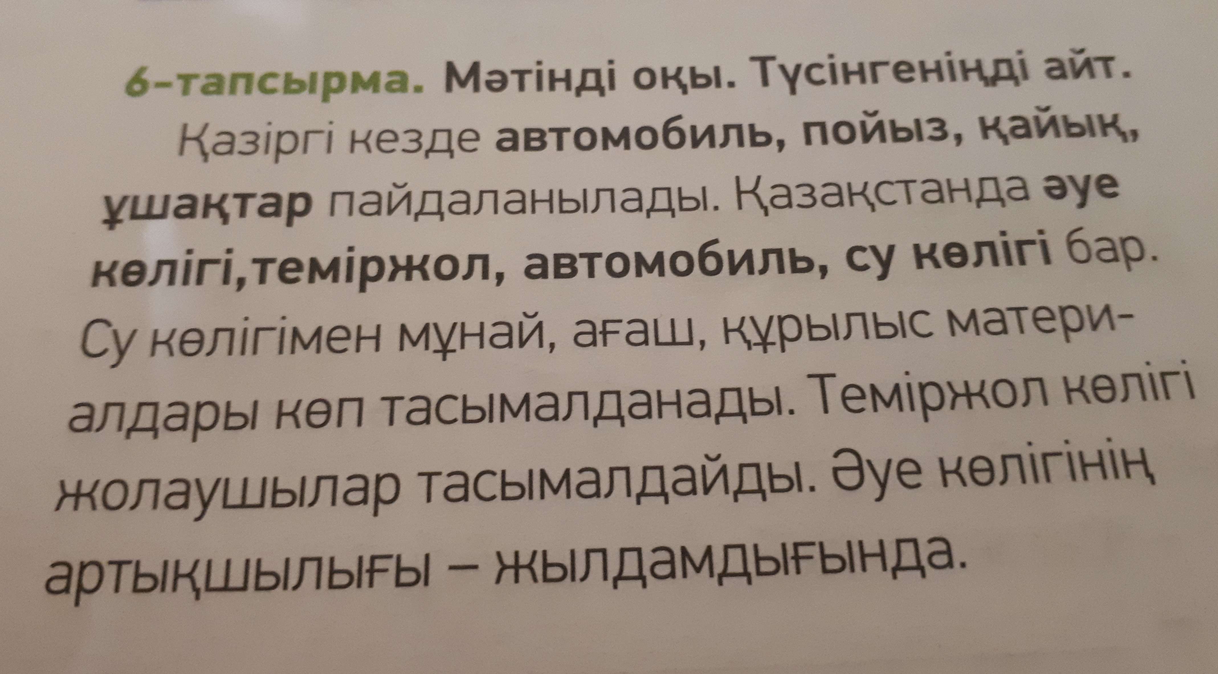 В Казахстане есть воздушный транспорт, железнодорожный, автомобильный, водный транспорт. Водный транспорт тяжело транспортируется нефтью, деревом, строительными материалами.