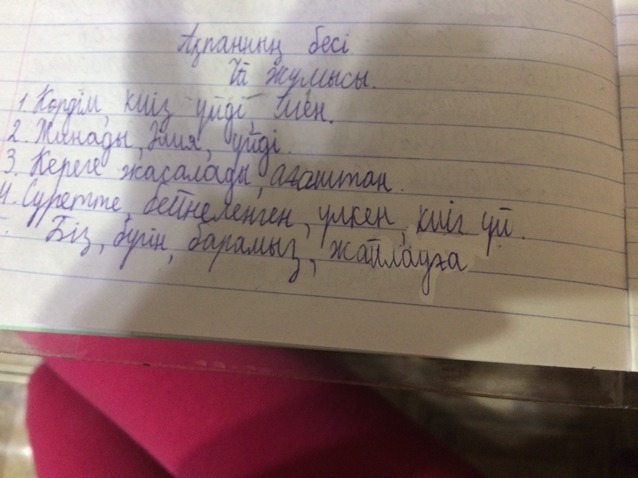 Мен киіз үйді көрдім. Әлия үйді жинады. Кереге ағаштан жасалады. Суретте үлкен киіз үй бейнеленген. Біз бүгін жайлауға барамыз.