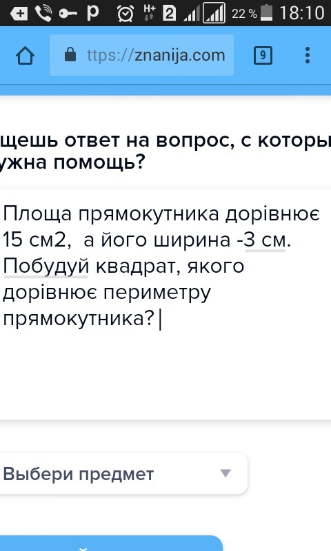 Площа прямокутника дорівнює 15 см2, а його ширина - 3 см. Побудуй квадрат, якого дорівнює периметру прямокутника?