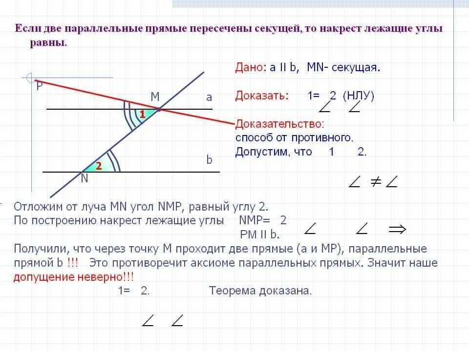 Если а параллельна b, то при пересечении двух прямых секущей н/л углы равны.