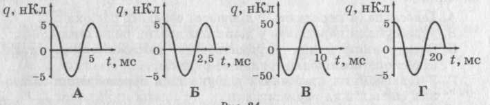 Заряд конденсатора коливального контура змінюється за законом 10^-9 cos 800 пt. На рис. 24 виберіть графік залежності q(і).