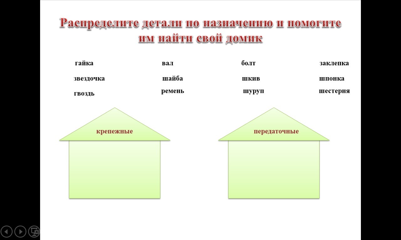 Крепёжные:гайка,звёздочка,гвоздь,шайба,болт,шуруп,заклёпка, шестерня