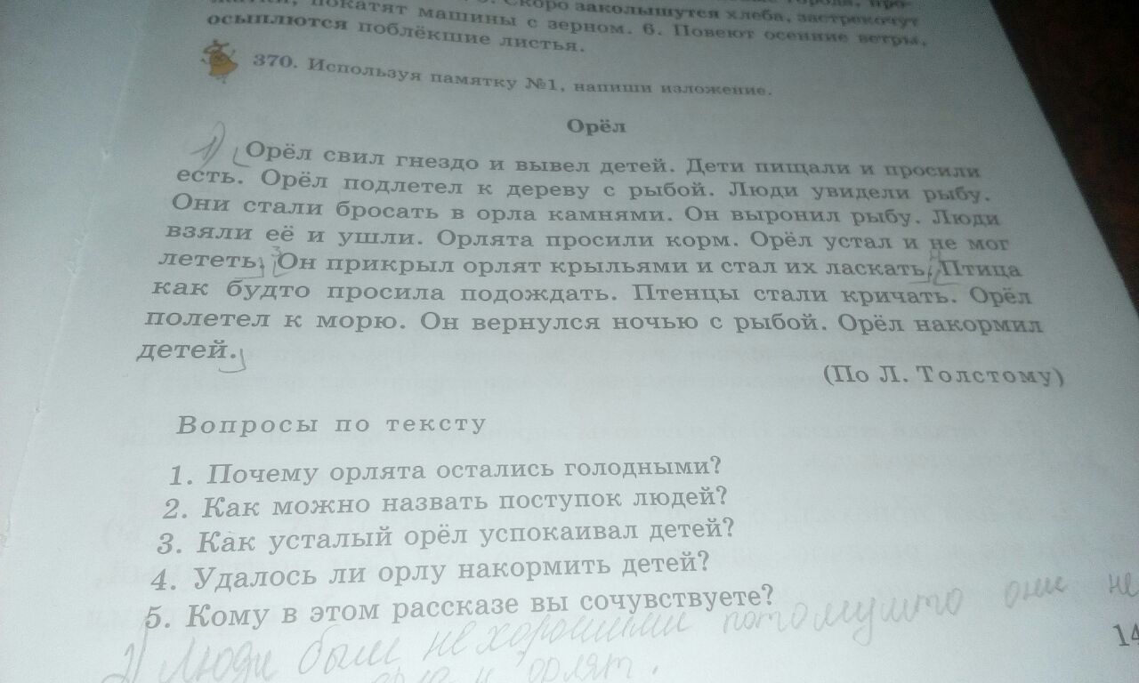 Почему орлята остались голодными? Потому что в орла люди кидали камни. Как можно назвать поступок людей? Поступак людей можно назвать плохим. Как усталый орёл успокоил детей? Он их накормил.удолось ли орлу успокоить детей. Да орлу удолось успокоить детей.
