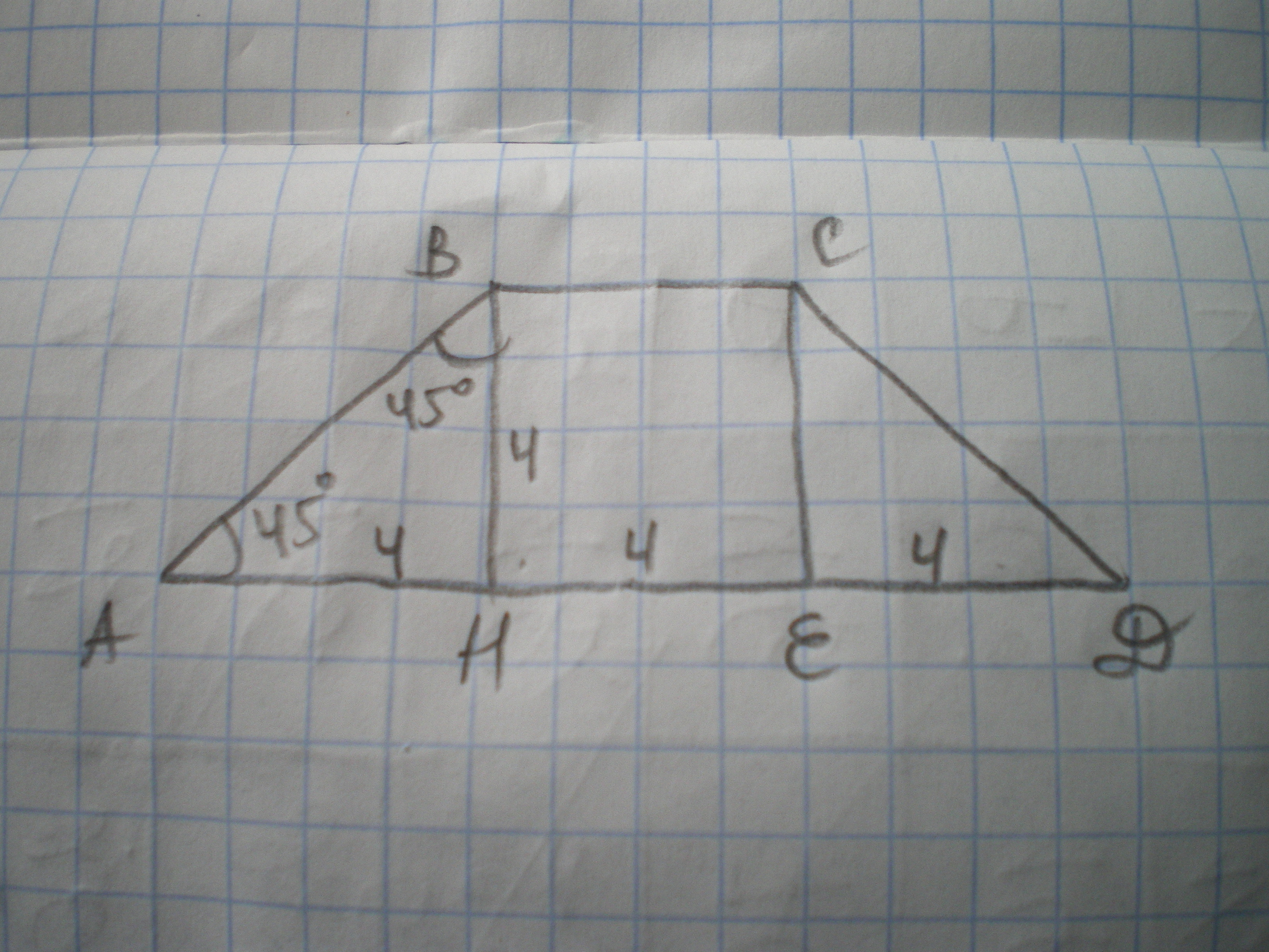 Проведем высоты трапеции ВН и СЕ. Тогда НЕ=ВС=4 см. По условию, трапеция равнобедренная, значит АН=ЕД=(АД-НЕ):2=(12-4):2=4 см.