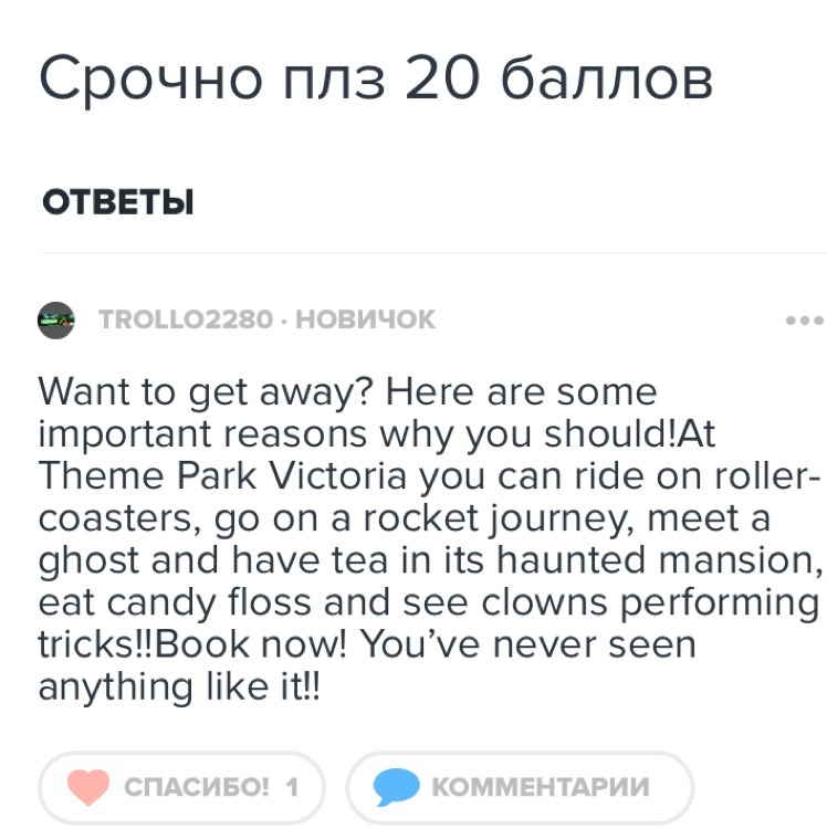 Хочешь вернутся?Вот несколько важных причин,которые тебе нужны!В тематическом парке Виктория ты можешь покататься на американских горках,полетать на ракете,встретить приведение и попить чай в заброшенном доме,поесть сладкую вату и увидеть клоунов исполняющие трюки!Заказывайте сейчас!Ты никогда не увидешь подобное на это.