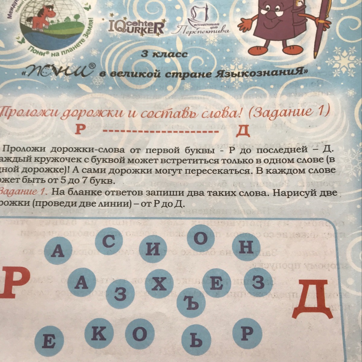 Проложи дорожки-слова от первой буквы-Р до последней-д.Каждый кружочек с буквой может встретиться только в одном слове (в одной дорожке).А сами дорожки могут пересекаться.В каждом слове может быть от 5 до 7 букв.На бланке ответов запиши два таких слова.Нарисуй две дорожки (проведи две линии) от Р до Д.