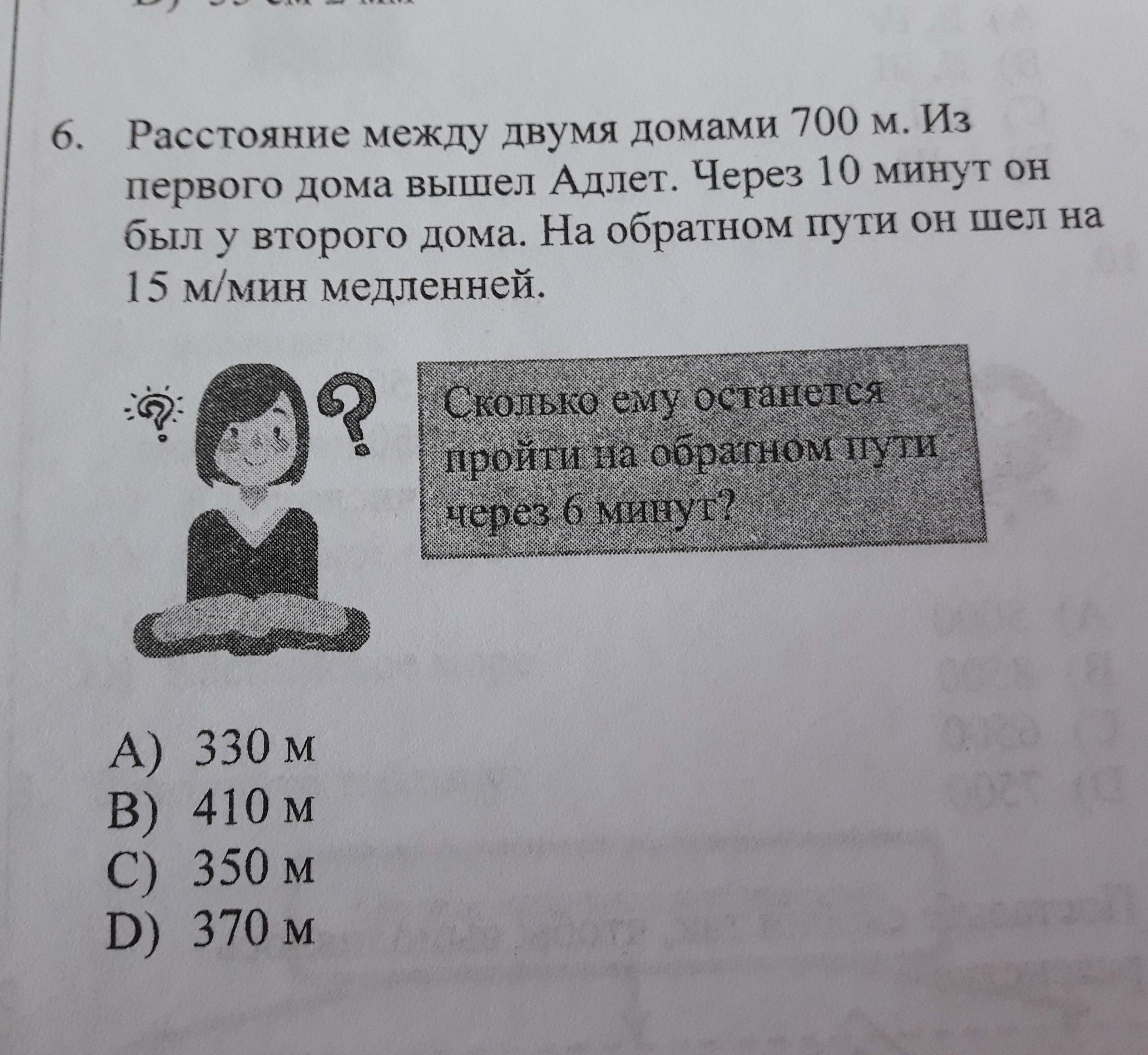 расстояние между 2 домами 700м из 1 дома вышел Адлет через 10 мин он был у 2 дома на обратном пути он шёл на 15 м мин медленней
