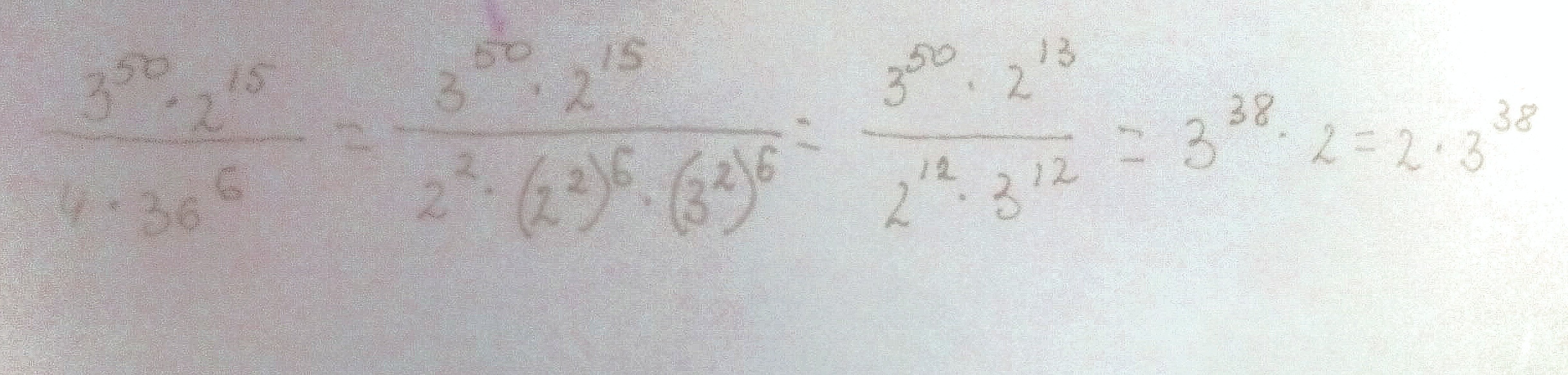 (3⁵⁰ * 2¹⁵)/(4 * 36⁶) = (3⁵⁰ * 2¹⁵)/(2² * 6¹²) = (3⁵⁰ * 2¹⁵)/(2² * 2¹² * 3¹²) = (3⁵⁰ * 2¹⁵)/(2¹⁴ * 3¹²) = 3⁵⁰⁻¹² * 2¹⁵⁻¹⁴ = 3³⁸ * 2