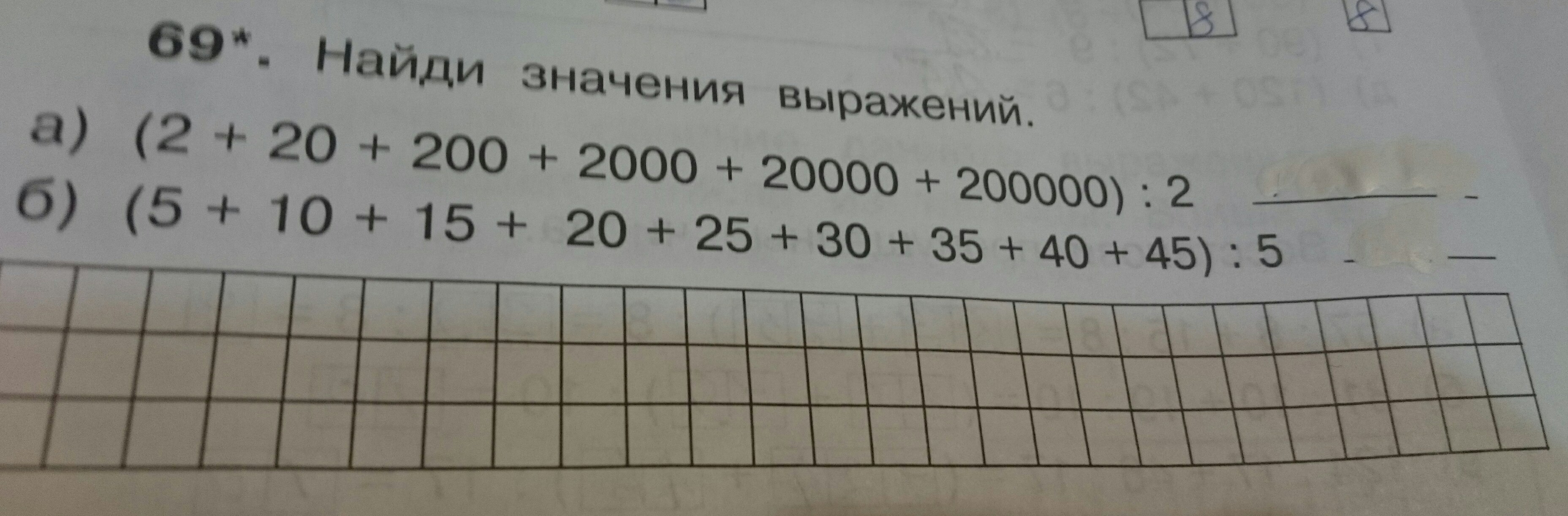 Найди значение выражения (а) 2 +20 + 200 + 2000 + 20000 + 2000000 / 2 (Б) 5+ 10 + 15 + 20 +25 +30 + 35 + 40 + 45 / 5