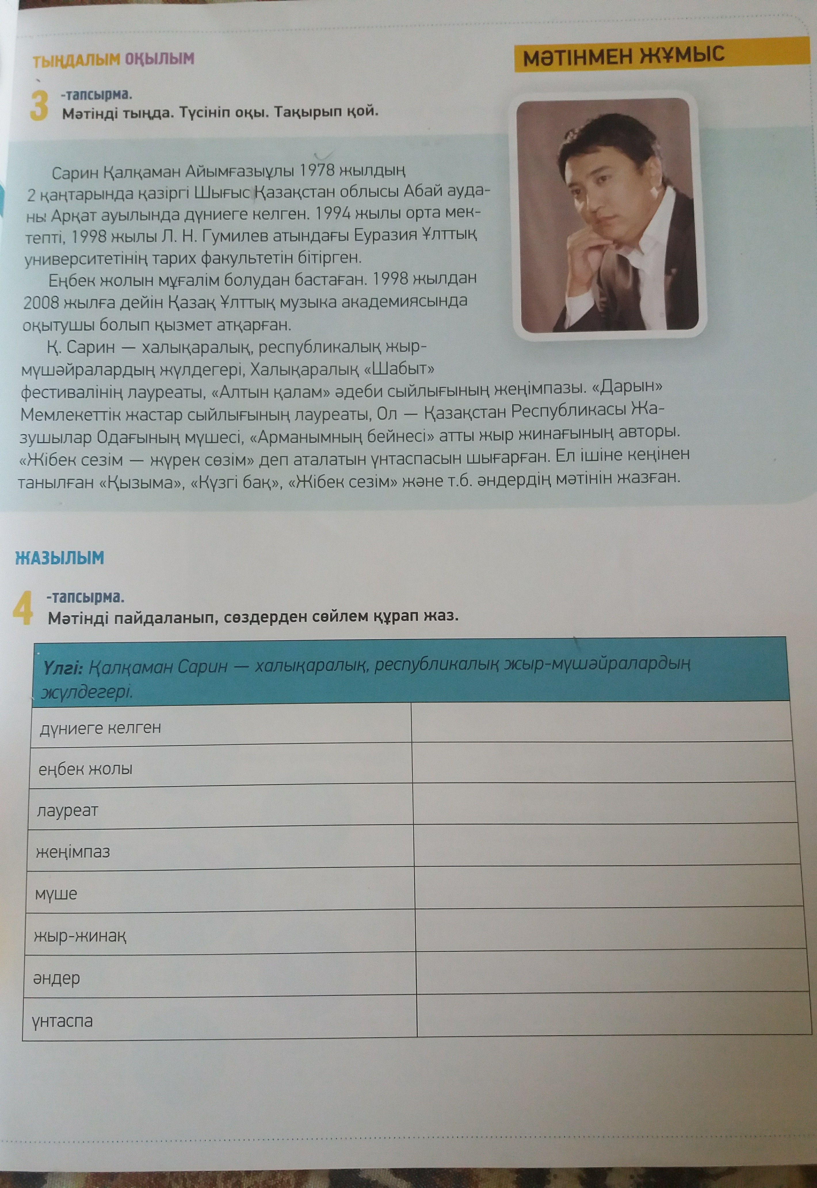 Ол 1978 жылдың екінші қаңтарында қазіргі Шығыс Қазақстан облысы Абай ауданы Арқат ауылында дүниеге келген. Еңбек жолын мұғалім болудан бастаған. Қ.Сарин халықаралық Шабыт фестивалінің лауреаты және "Алтын қалам" әдеби сыйлығының жеңімпазы. Ол Қазақстан Жазушылар Одағының мүшесі, "Арманымның бейнесі" атты жыр жинағының авторы. Сондай-ақ ол ел ішінде кеңінен танылған "Қызыма", "Күзгі бақ", "Жібек сезім" әндерінің мәтінін жазған және "Жібек сезім-жүрек сөзім" деп аталатын үнтаспа шығарған.