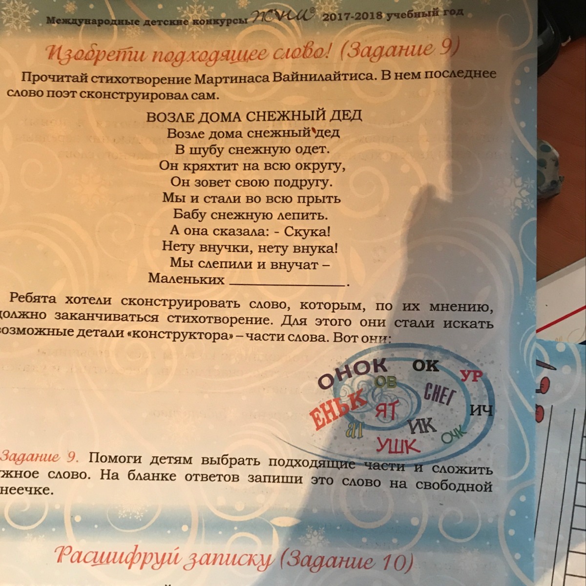Прочитай стихотворения Мартинаса Вайнилайтиса,В нем последнее слово поэт сконструировал сам.Ребята хотели сконструировать слово,которым по их мнению, должно заканчиваться стихотворения.Для этого они стали искать возможные детали конструктора части слова.Вот они